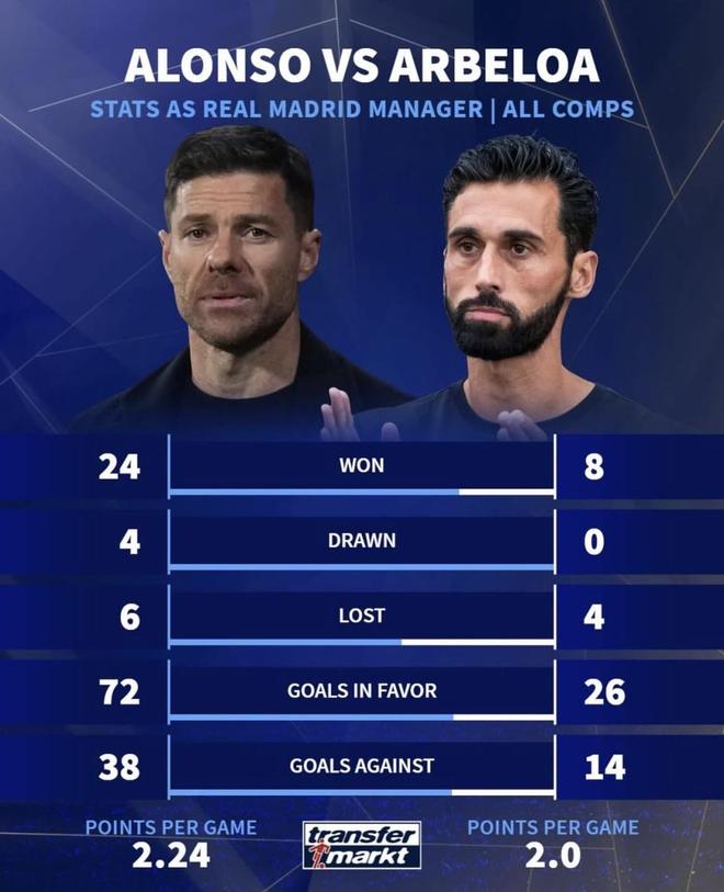 可问题在于,气氛改善,并不等于成绩已经完成反转。德国转会市场的跟进内容写得很清楚:阿韦洛亚时期,皇马场均进球约2.16个,阿隆索时期约2.11个,进攻输出差距并不大;而在拿分效率上,阿韦洛亚的场均2.0分仍低于阿隆索的2.24分。也就是说,新帅带来的变化,目前更多体现在观感和队内状态上,还没有稳定地反映到积分效率上。