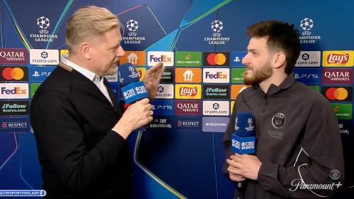 欧冠1/8决赛首回合,巴黎主场5-2战胜切尔西,本场比赛上演2球1助的克瓦拉茨赫利亚接受了CBS体育的赛后采访。